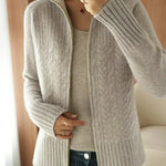 O padrão de tranças e a cor pêssego conferem ao cardigan um aspeto elegante e moderno.
