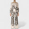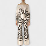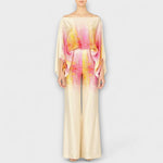 O conjunto Claudia™ é uma verdadeira explosão de estilo e atitude – desenhado para mulheres que ousam destacar-se. Com um exclusivo padrão em ondas em tons vibrantes de rosa, laranja e vermelho sobre um fundo suave e creme, este conjunto irradia pura elegância e charme. A parte de cima assimétrica com detalhes de mangas largas traz um toque de diversão e movimento, enquanto a calça larga alonga e realça a silhueta. Perfeito para festas de verão, looks de férias ou qualquer ocasião em que queira brilhar com estilo e conforto.